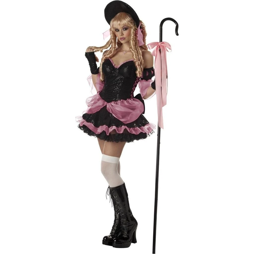 The Goth Little Bo Peep Costumes includes a black and pink dress with attached petticoat. The costume also comes with detached sleeves, glovelettes and stockings. The character bonnet completes the Bo Peep look.