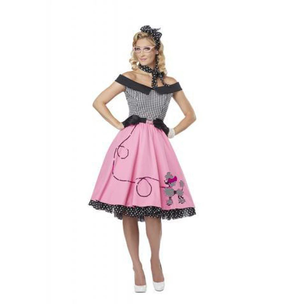 This fun Nifty 50’s Costume includes the pink poodle dress, pettiskirt, polka dot neck scarf, the matching head tie and the belt.