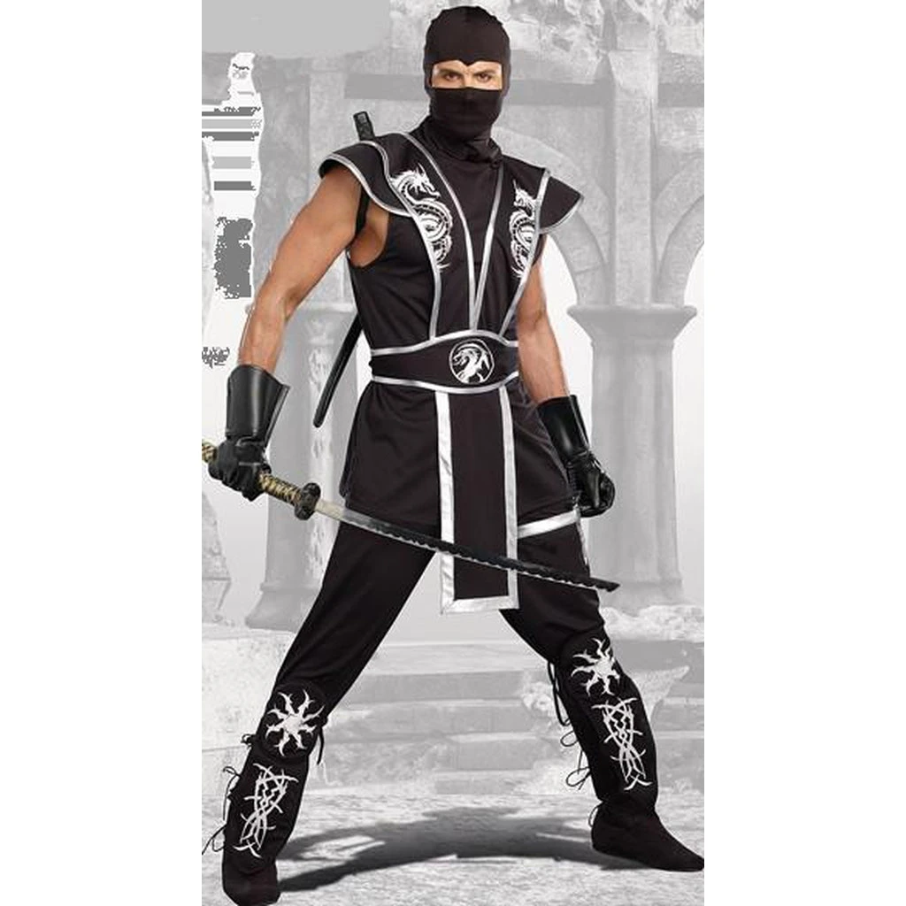 Stay un-seen in this 5pc Blades of Death Ninja costume featuring a black knit tunic with dragon screen print and ninja styling, mask, belt, knee pads with ninja screen prints and one leg garter.