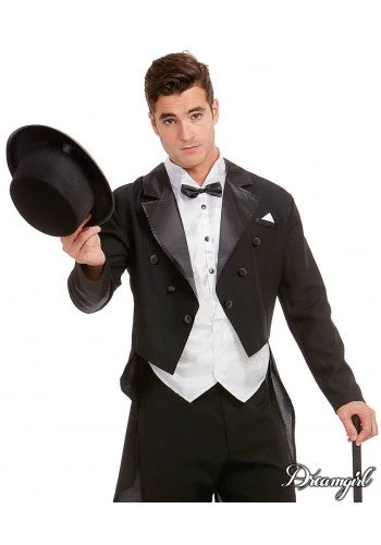 Wish you were living back in 1920? This Gatsby costume comes with a tailored tailcoat with satin lapels and pocket with attached handkerchief, a swoop vest with attached shirtfront, bow tie and collar.