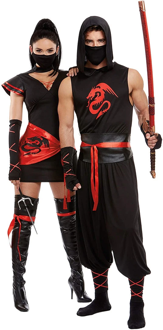 You can be as silent and invisible as you want in this sleek ninja costume which includes a dress with faux leather sleeves, a sarong with a dragon print, fingerless gloves, face mask, garter, dagger and leg ties.