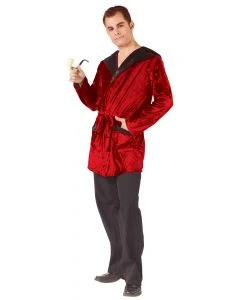 Red panné smoking jacket with black lapels, matching tie belt, and pockets with black trim. Includes a prop pipe.