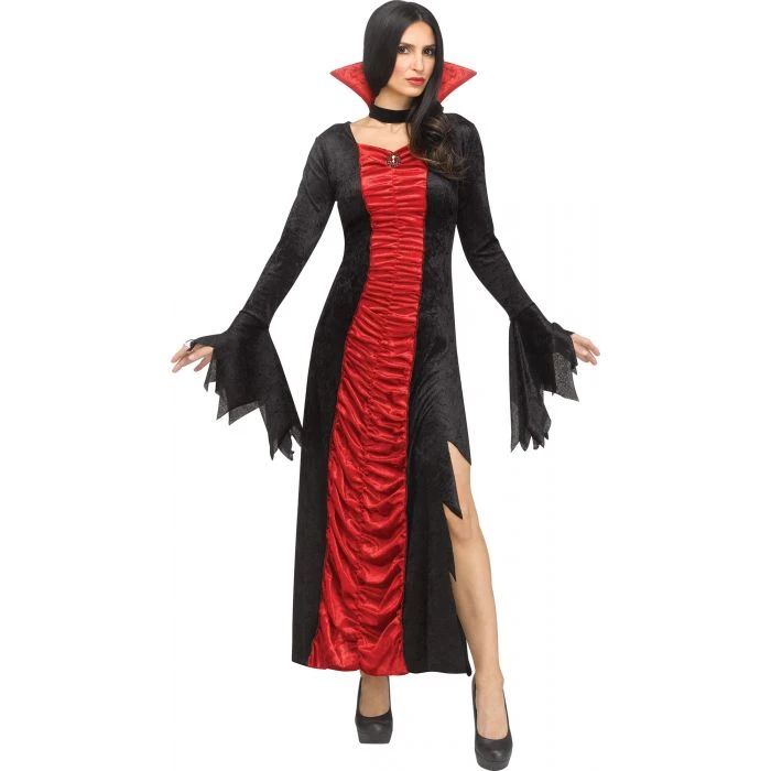 This costume features a black gown with a side slit, long sleeves with a sawtooth cuff and a red panne panel down the front and a choker with a stand-up collar.