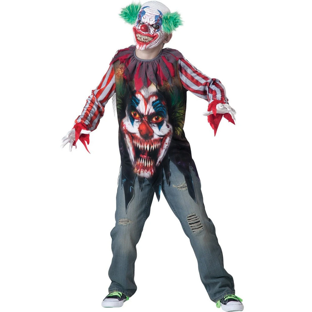 Includes: Shirt with clown print, collar and vinyl mask with plush hair. (Gloves & pants not included)