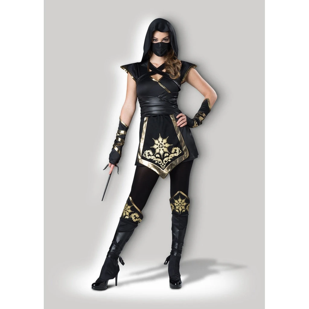 In an outfit so striking she’ll have a hard time sneaking up on anyone, this bold ninja’s costume comes complete with gold print details, arm gauntlets and face mask for added mystery.