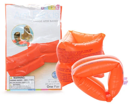 Inflatable arm bands help children learn the swimming basics.