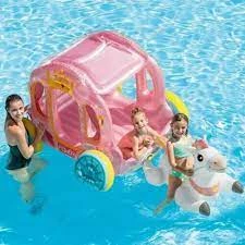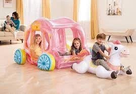 Your little ones will feel like royalty on this magical Intex Princess Carriage inflatable ride-on that is suitable for both indoor and outdoor use. This enchanting pearlescent pink carriage is constructed with durable 12ga vinyl and comes with its own friendly hose, designed for ages 3+.