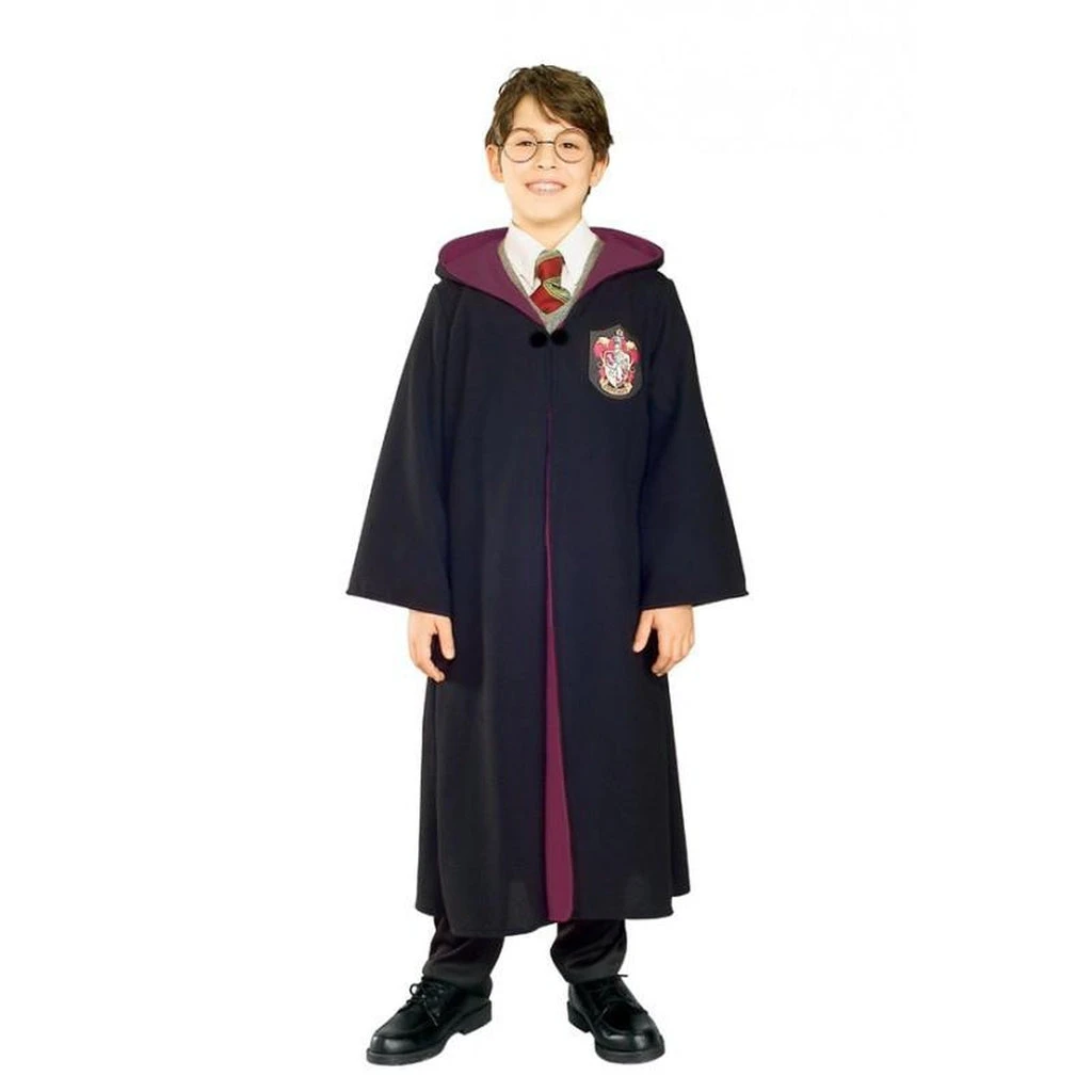The Deluxe Harry Potter Costume includes a full length black robe with maroon lining, clasp and a Gryffindor logo.