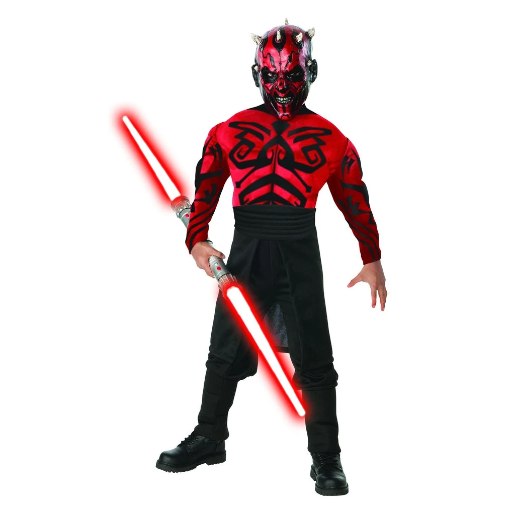 The Deluxe Darth Maul Costume includes a red and black jumpsuit with attached apron and muscle chest. The boot tops and half mask complete the evil villain look.