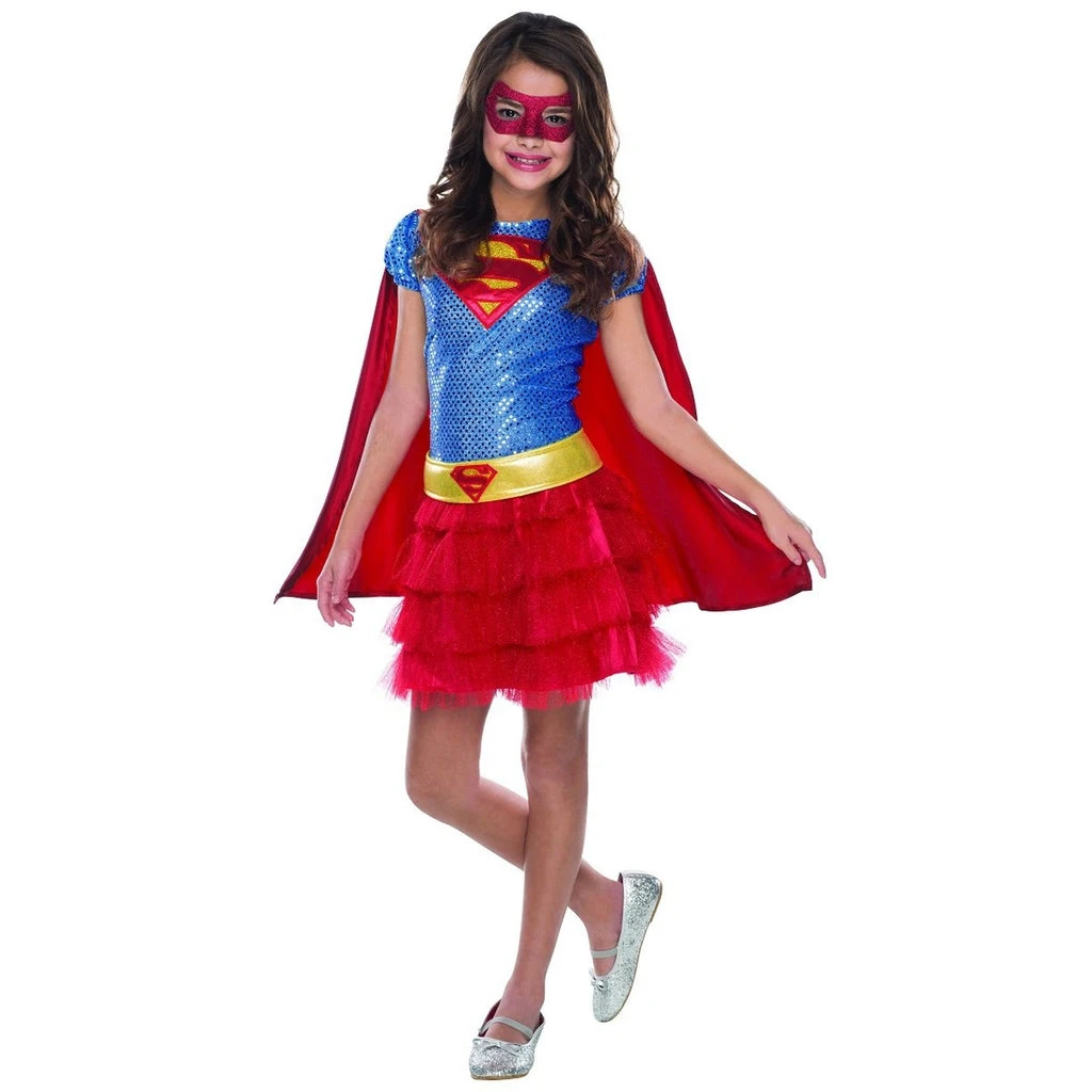 This Supergirl Tutu Dress Costume includes sparkle tutu dress, belt, cape and mask.