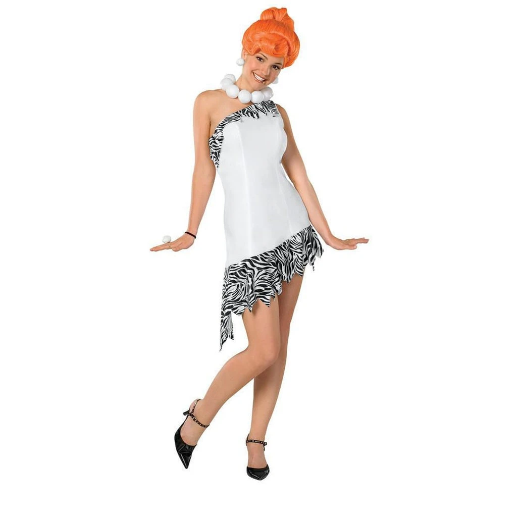 The Wilma Costume includes a white dress with zebra print embellishment. The orange character wig and white rock necklace complete the prehistoric look.
