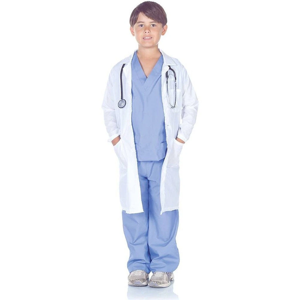 Includes: Blue doctor scrubs with white lab coat.