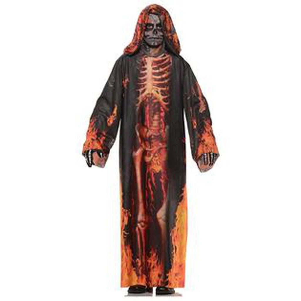 Includes: Hooded robe with photo real image of a skeleton and flames